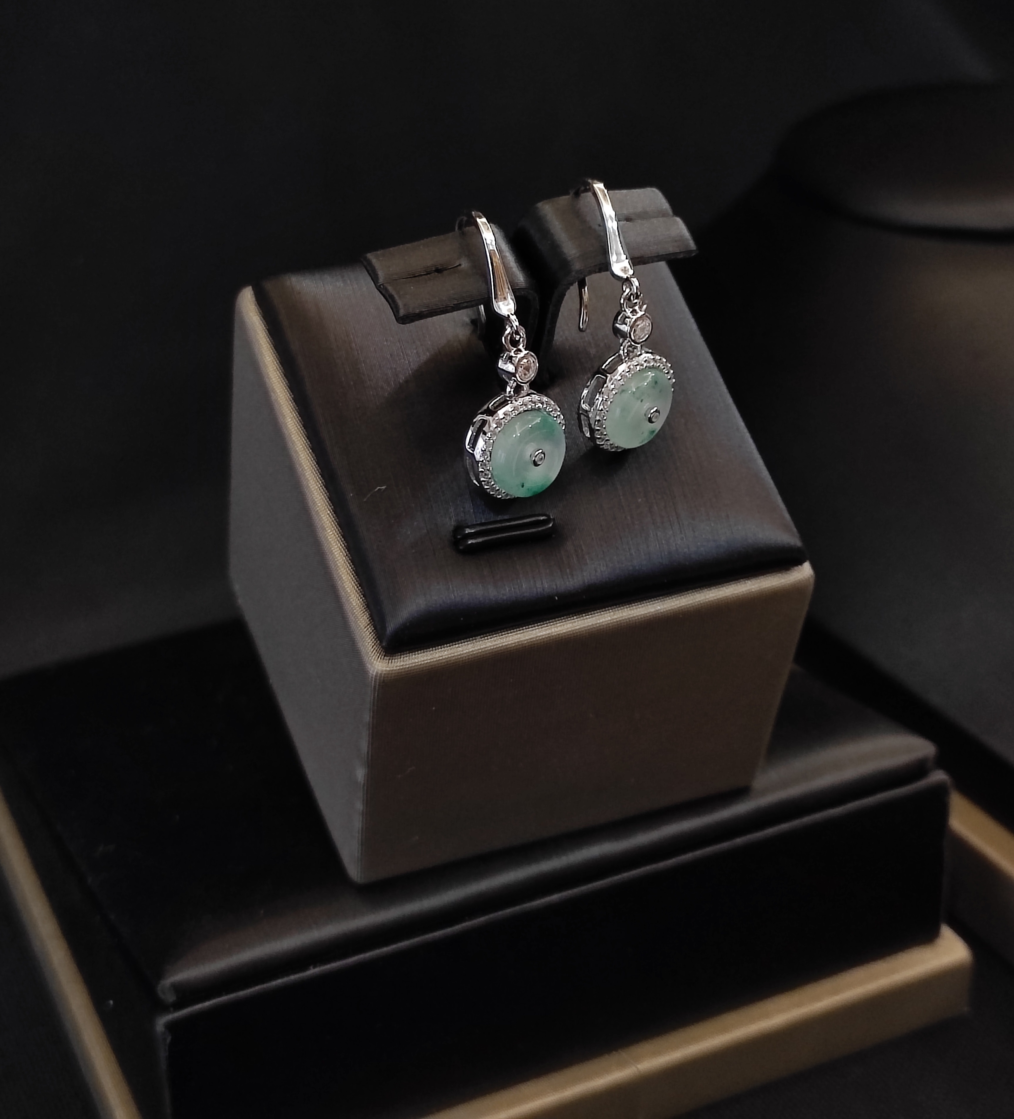 Viên ngọc Phỉ Thúy trắng chủ đạo được chế tác cabochon, tôn lên vẻ đẹp mềm mại và thanh tao.