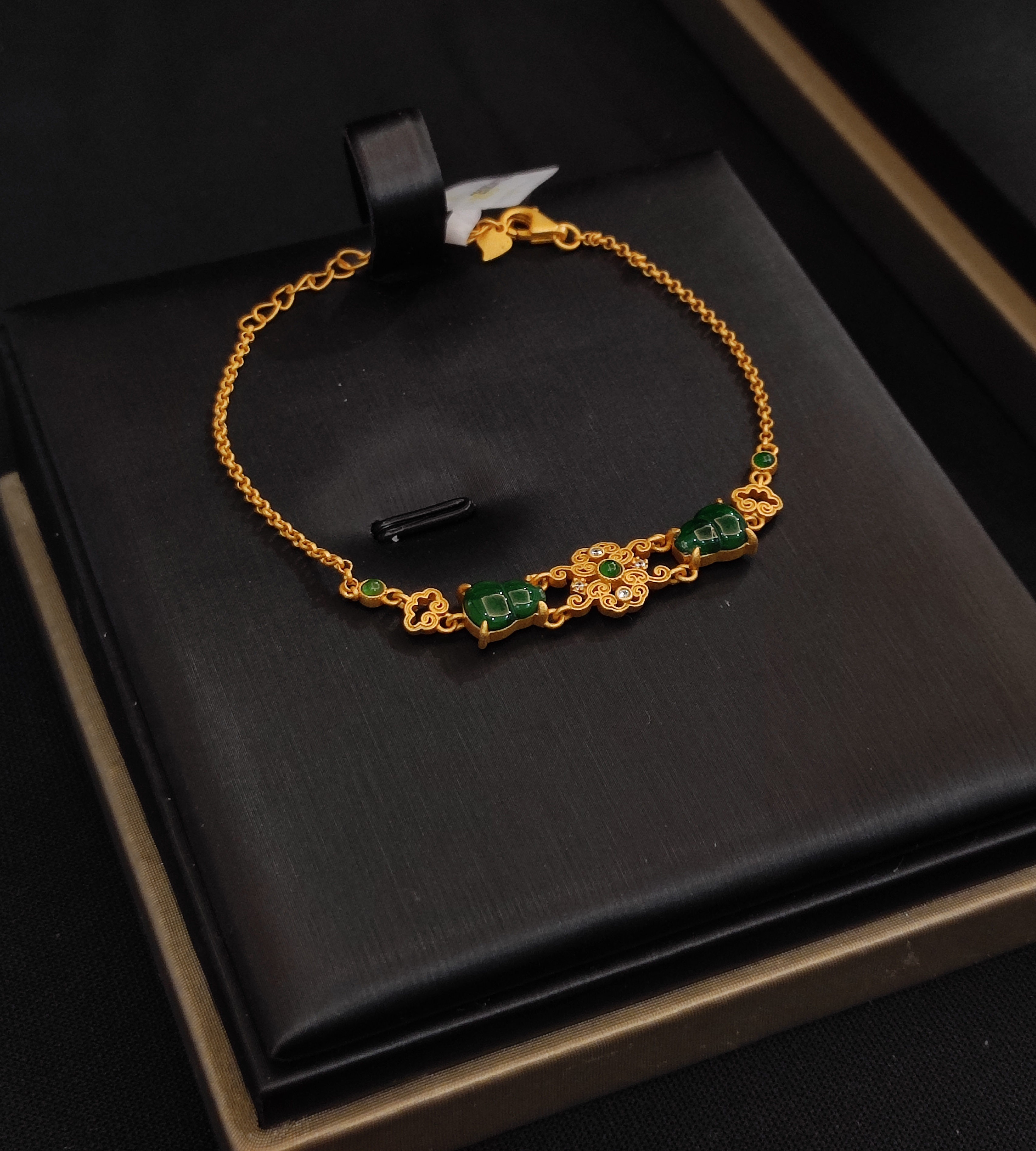 Ngọc phỉ thúy xanh lục tượng trưng cho sự bình an, may mắn và thịnh vượng. Ba viên ngọc hàm ý cân bằng – vững vàng – phát triển, đem lại nguồn năng lượng tích cực và sự tự tin cho người sở hữu.
